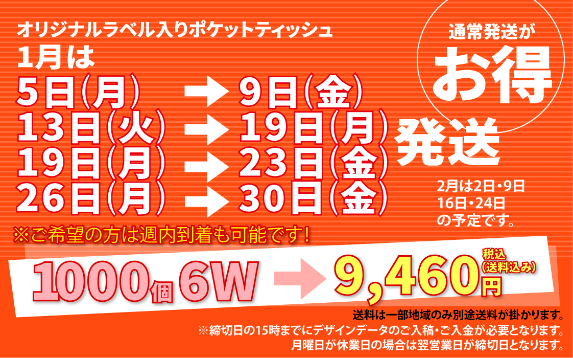 チラシに比べて使用頻度の高いオリジナルポケットティッシュは、街頭配布の定番商品です。