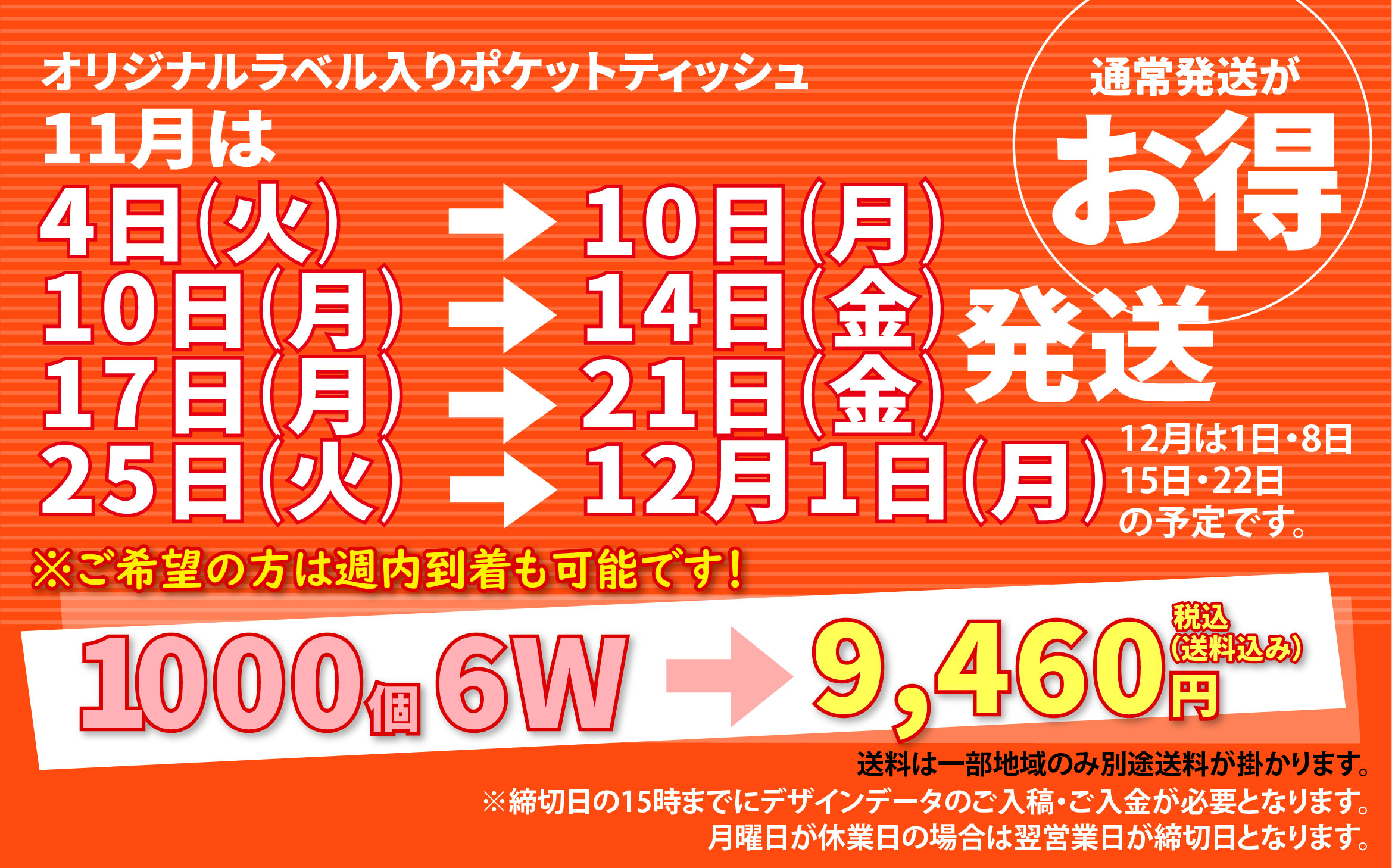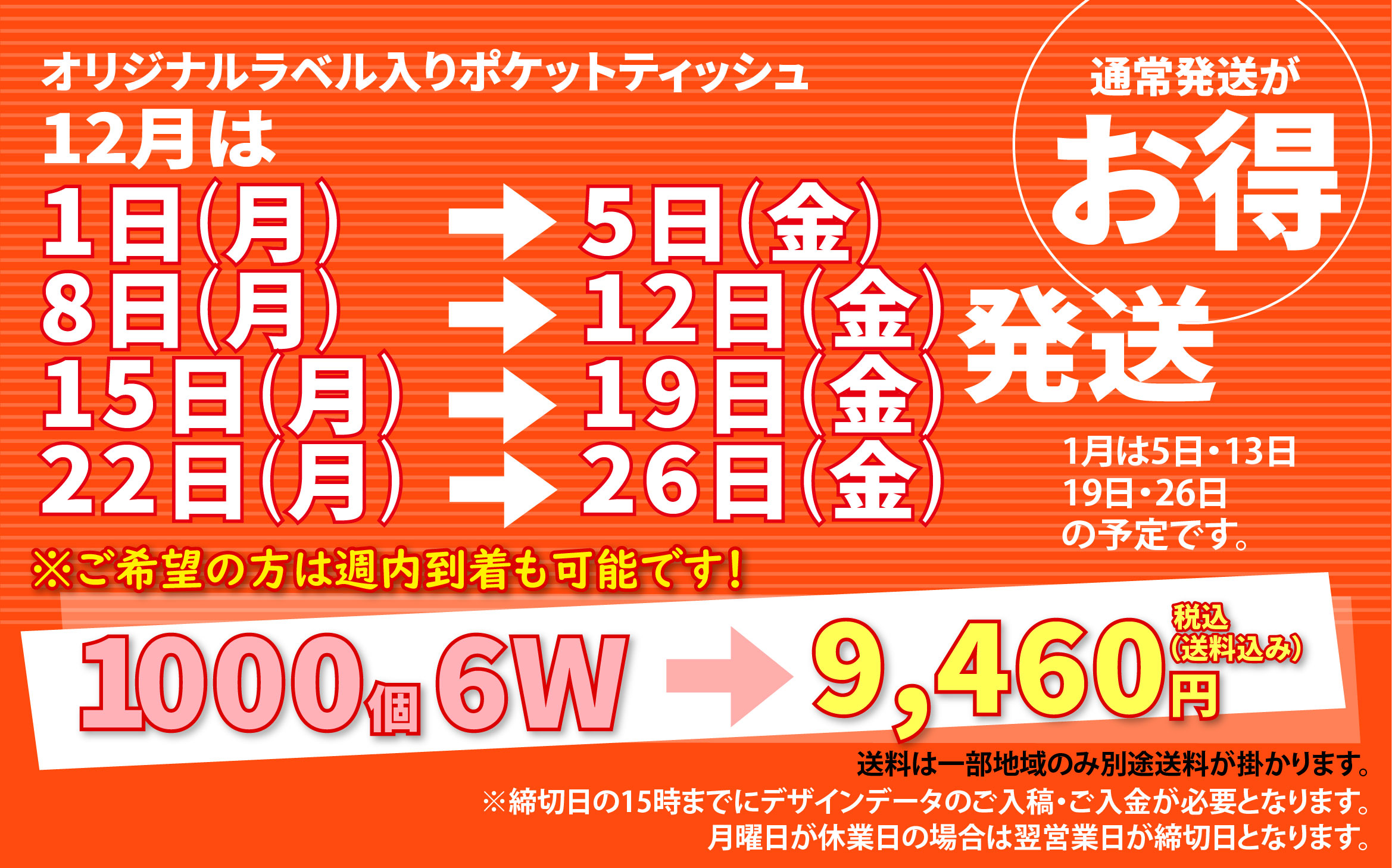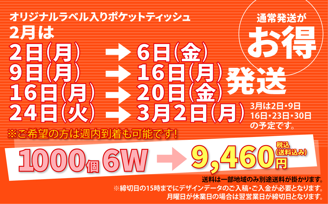 チラシに比べて使用頻度の高いオリジナルポケットティッシュは、街頭配布の定番商品です。