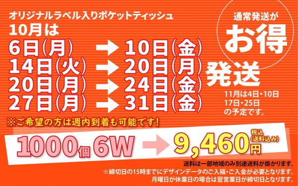 お見積フォーム メンバーログイン・登録 お問い合わせフォーム 商品一覧 過去見本 ポケットティッシュ ウェットティッシュ BOXティッシュ うちわ・竹うちわ・紙うちわ カレンダー ペーパーバック あぶらとり紙 マルチクリーナー ボールペン ライター タオル カイロ・入浴剤・マスク 営業日カレンダー 𝕏(Twitter) Tweets by promolandstaff トップページ > お知らせ一覧 > 2025年10月のポケットティッシュお得発送 2025年10月のポケットティッシュお得発送 2025/09/30(火) 2025年10月のポケットティッシュ「お得発送」は以下の日程になります。6日(月) → 10日(金)14日(火) → 20日(月)20日(月) → 24日(金)27日(月) → 31日(金)ぜひご利用ください!※2025年11月のお得発送は 4日、10日、17日、25日の予定です。 <<戻る